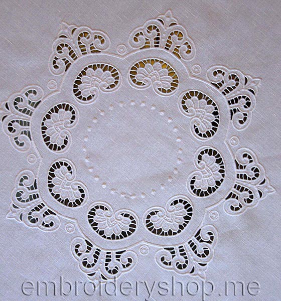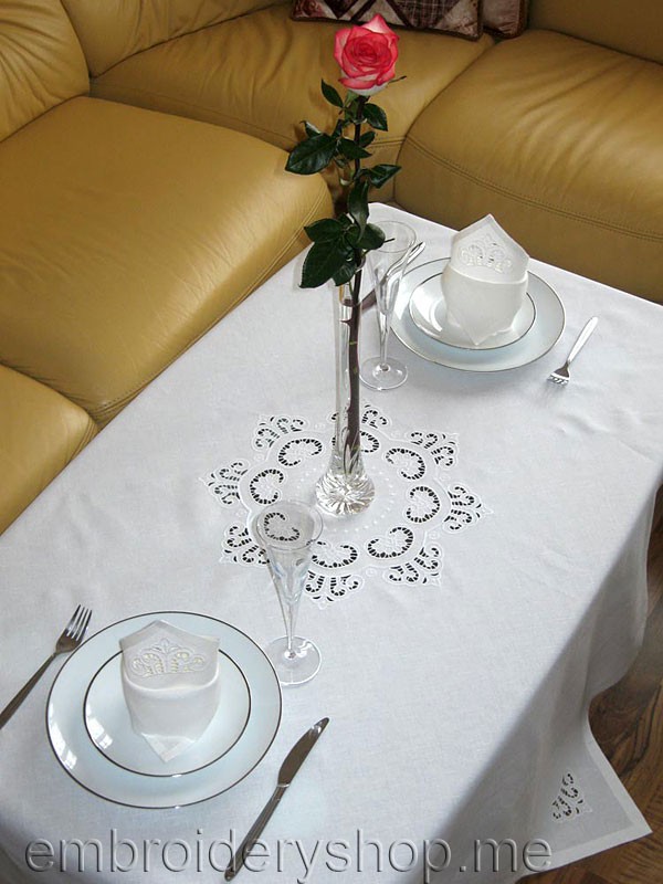 The tablecloth design is embroidered 4 times in a circle. The outer circle diameter will be 402 mm. For precise matching check crosses are provided.