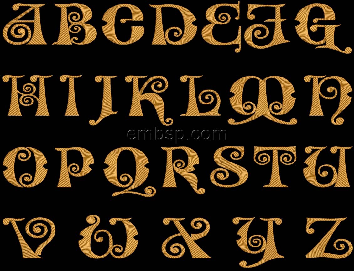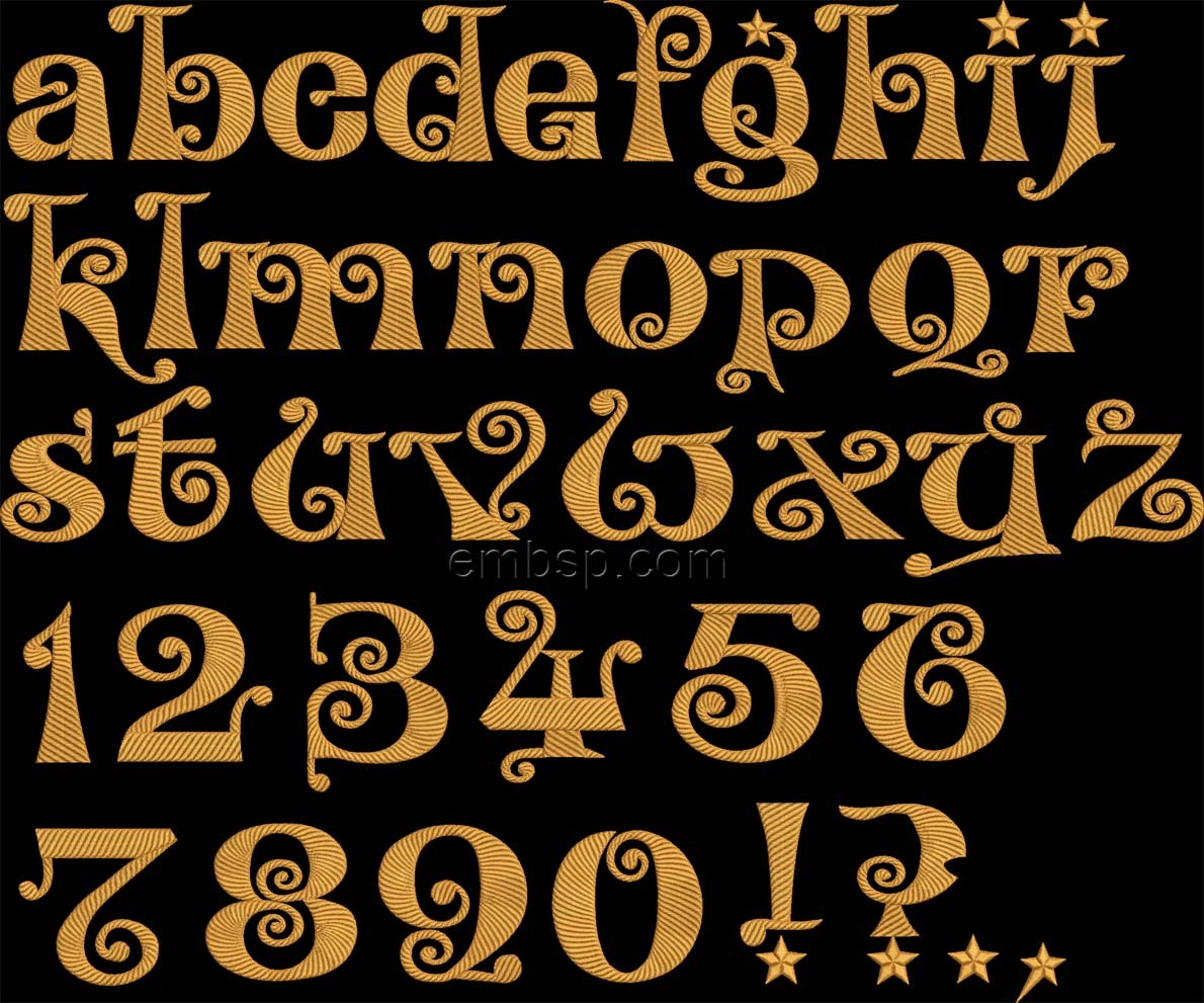 A font for embroidery. The set consists of 66 designs. Supplied in PES, HUS, DST, XXX, JEF, VIP.