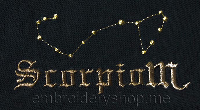 Inscription Scorpio Machine Embroidery Designs size 94*44mm3,00 $ Inscription Scorpio Machine Embroidery Designs size 94*44mm quantity Add to cart Description Description Author Nataliya Ryazanova Size, мм 94*44 Colors 3 Stitches 2551 In PES, HUS, DST, ART, XXX, JEF, VIP. Related products Little hare Machine Embroidery Designs size 105*150mm 5,00 $ Lace Angel on chiffon Machine Embroidery Designs Size 117*122mm 7,00 $ Cutworks Flowers Machine Embroidery Designs The set consists of two designs 9,00 $ Lace Angel Christmas tree Machine Embroidery Designs Size 112*129mm 7,00 $