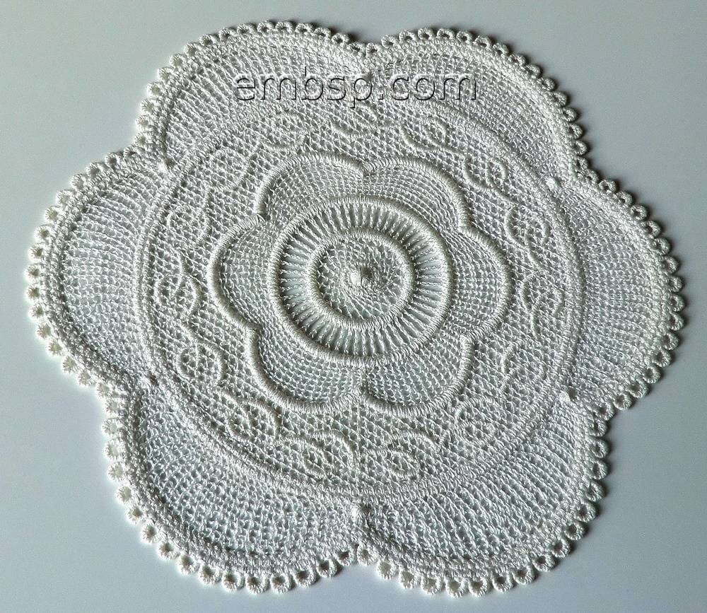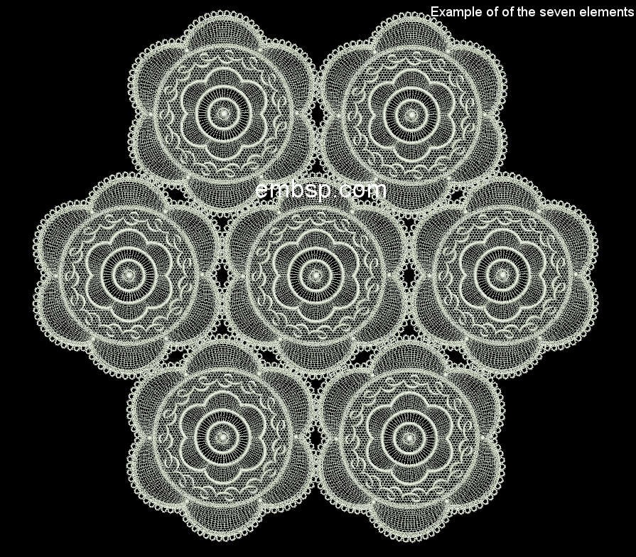 If embroider the design several times and sew elements to each other, it is possible to obtain products of different sizes, such as doilies, tablecloths, lace runners. The elements are sewn by hand. The picture shows an example of the seven elements.