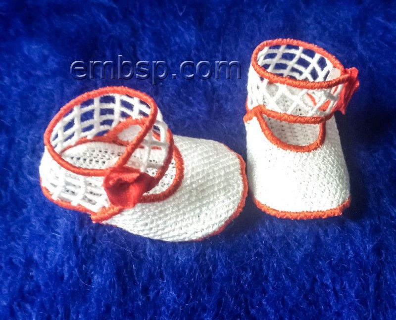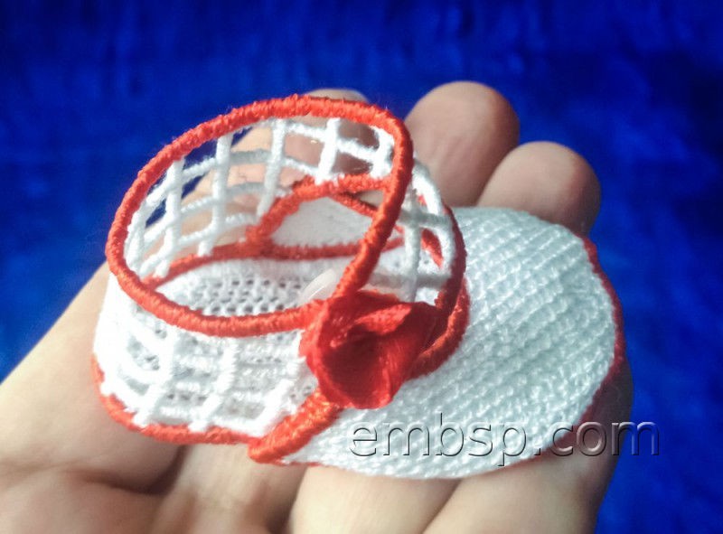 The design is embroidered on water-soluble stabilizer. The elements of the shoe are sewn on the sewing machine or manually.