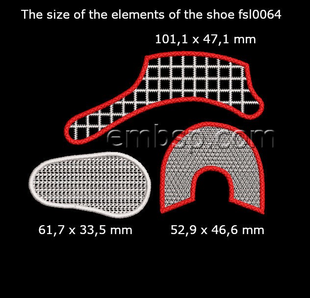 Design for the shoe on the left foot. The dimensions of the shoe elements are shown in the picture. To get the shoe on the right foot, the design should be embroidered in a mirror image.