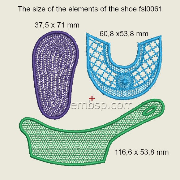The design is embroidered in one color on water-soluble stabilizer. The elements of the shoe are sewn on the sewing machine or manually.